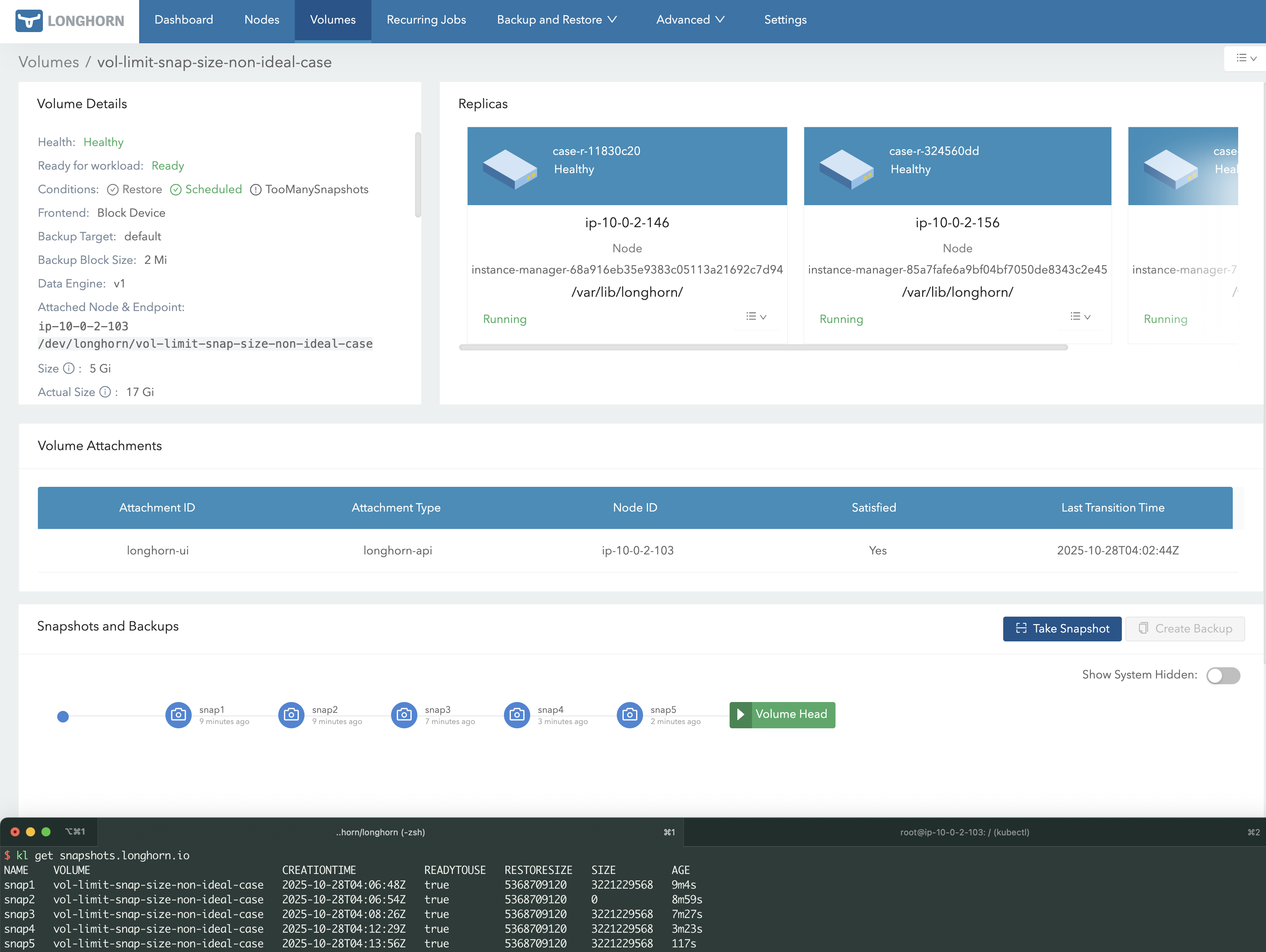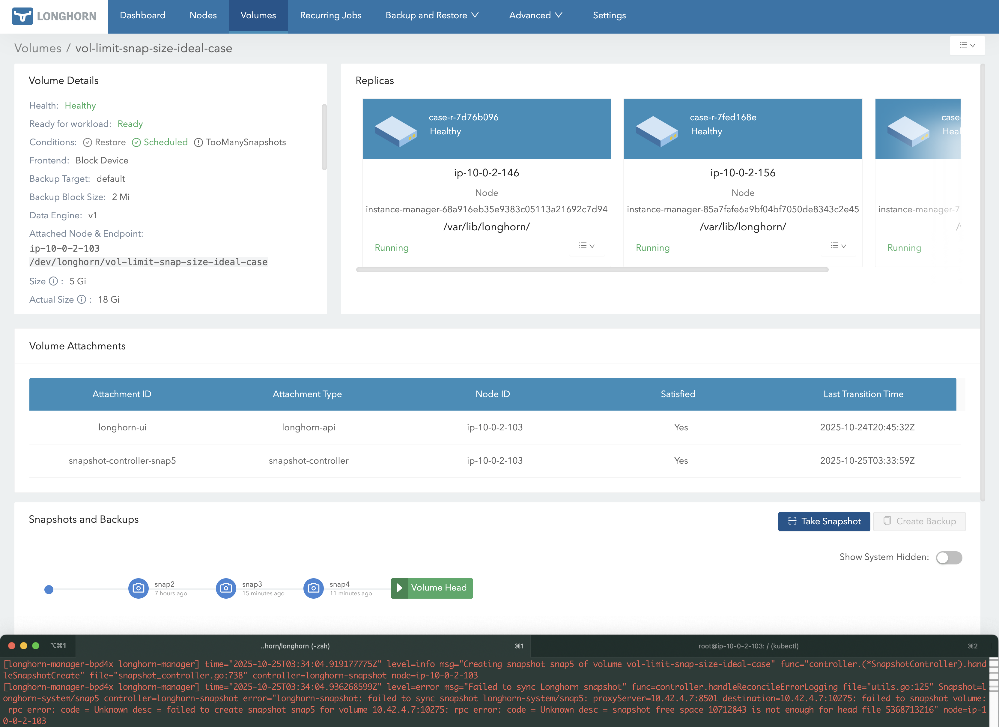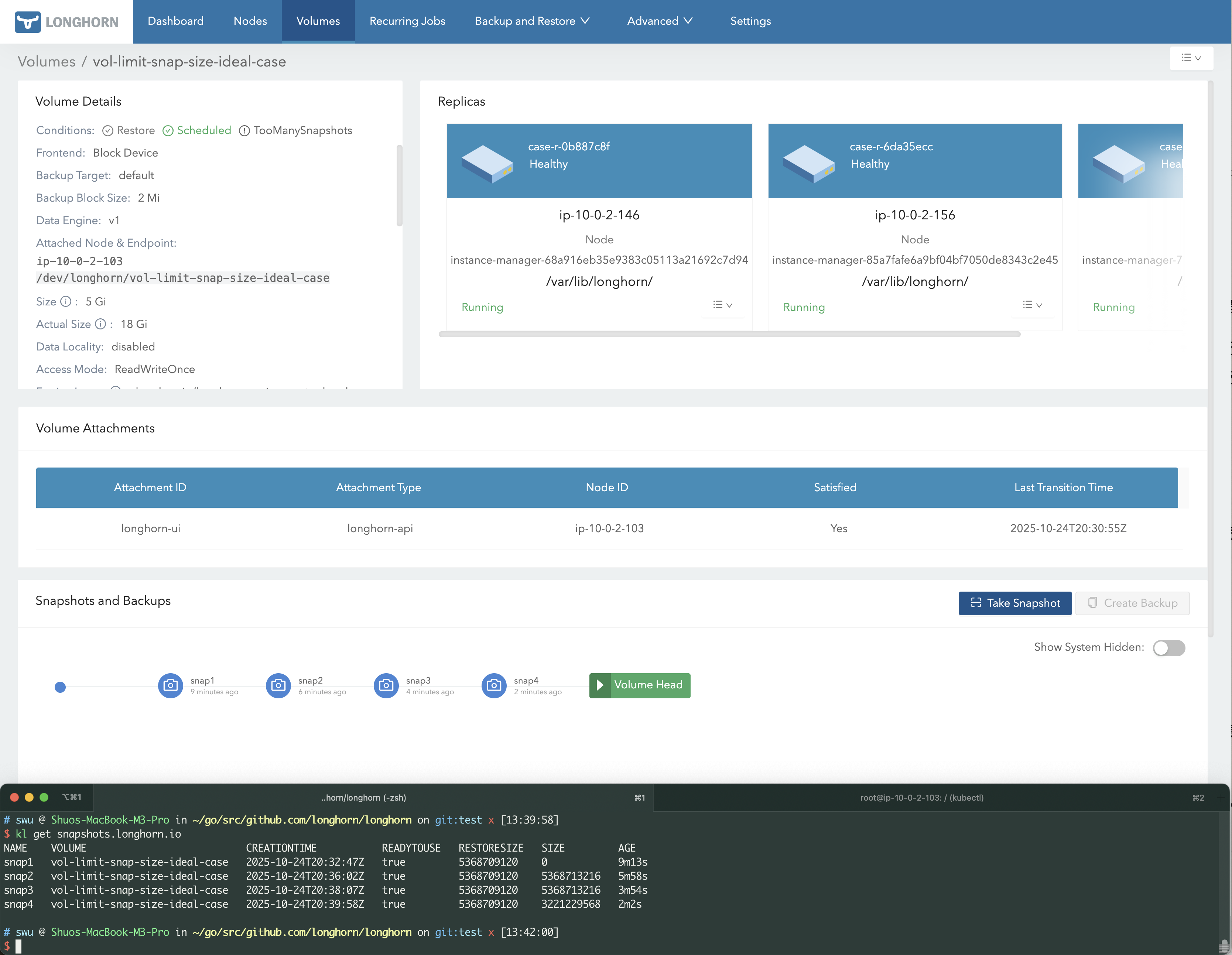 Therefore, after setting Snapshot Max Count or Snapshot Max Size, the maximum possible space usage of a volume replica becomes predictable — in other words, we are limiting the replica’s maximum space consumption.